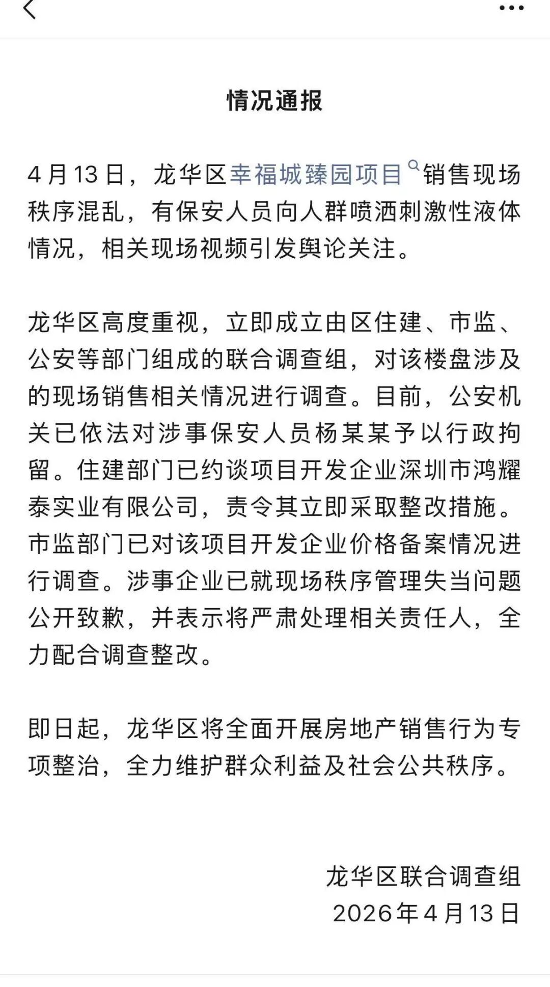 龙华区高度重视,立即成立由区住建、市监、公安等部门组成的联合调查组,对该楼盘涉及的现场销售相关情况进行调查。目前,公安机关已依法对涉事保安人员杨某某予以行政拘留。住建部门已约谈项目开发企业深圳市鸿耀泰实业有限公司,责令其立即采取整改措施。市监部门已对该项目开发企业价格备案情况进行调查。涉事企业已就现场秩序管理失当问题公开致歉,并表示将严肃处理相关责任人,全力配合调查整改。
